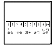 氧化鋯探頭和分析儀上各有6個(gè)接線端子,分別為: ① 氧勢(shì)+、氧勢(shì)-  ② 熱偶+、熱偶-  ③  加熱、加熱